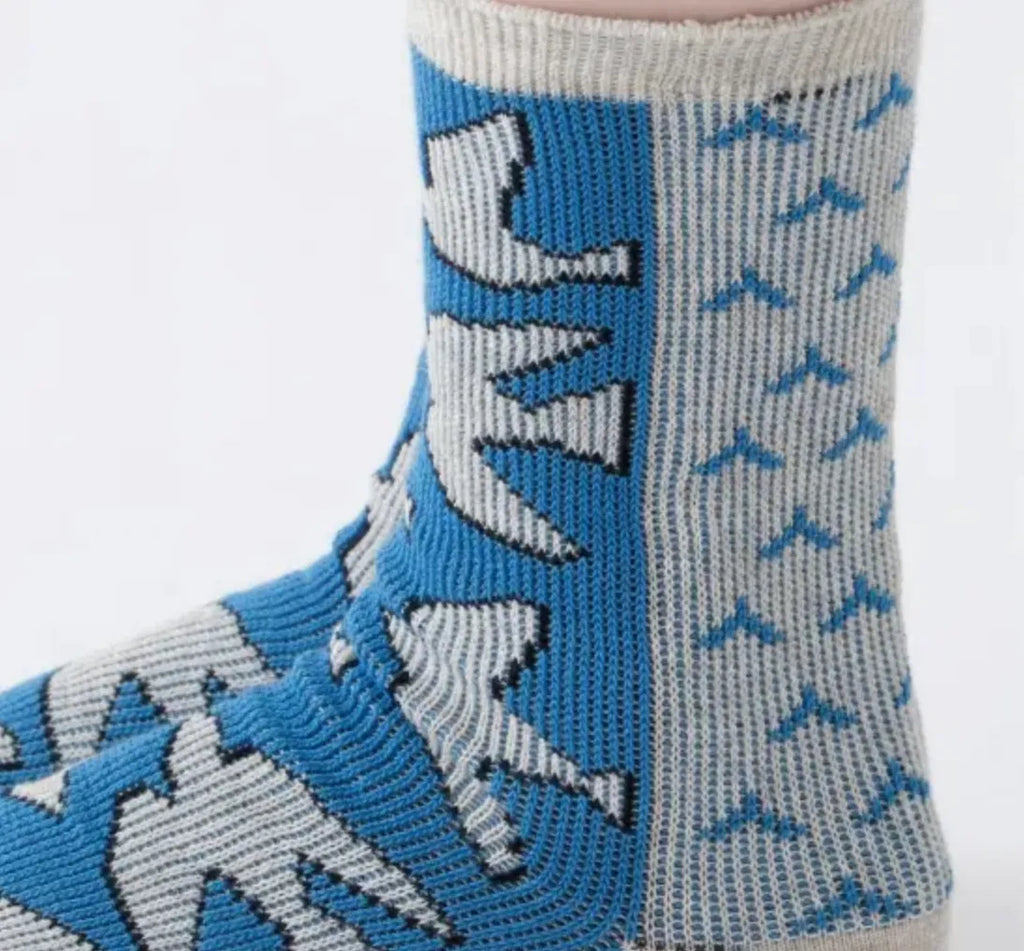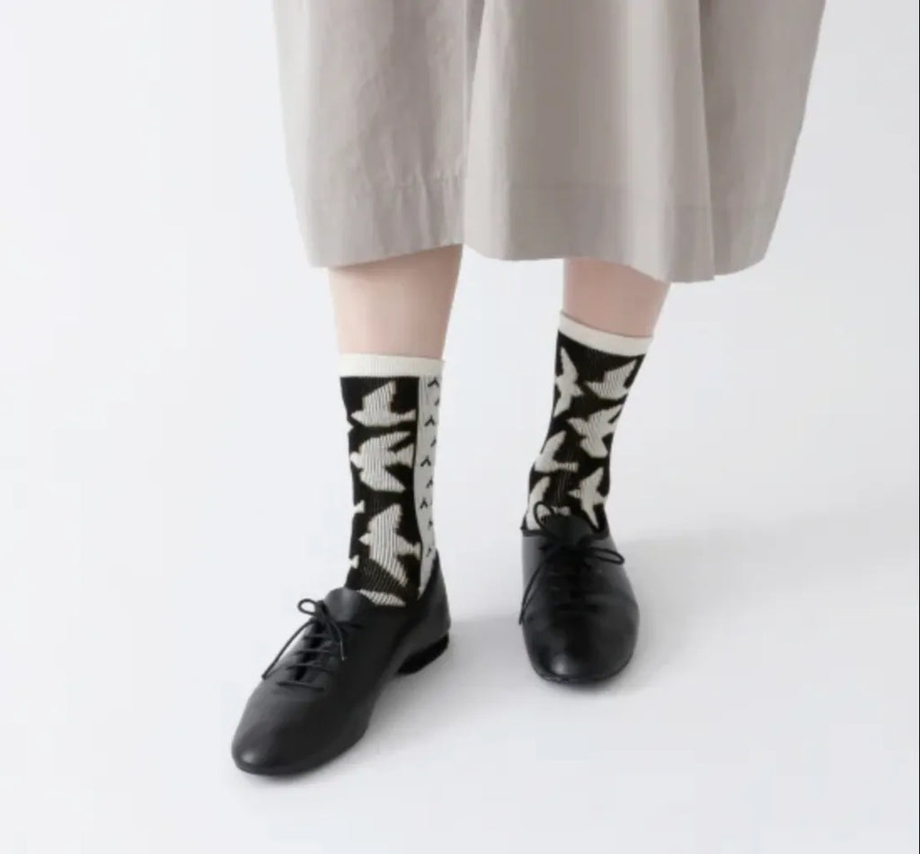 These socks feature a pattern inspired birds. They are thickly knitted with soft cotton yarn. This pair stands out as a stylish accent for any ensemble and is ideal for gifting.