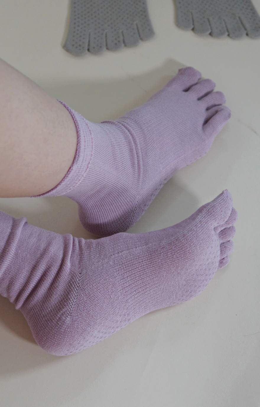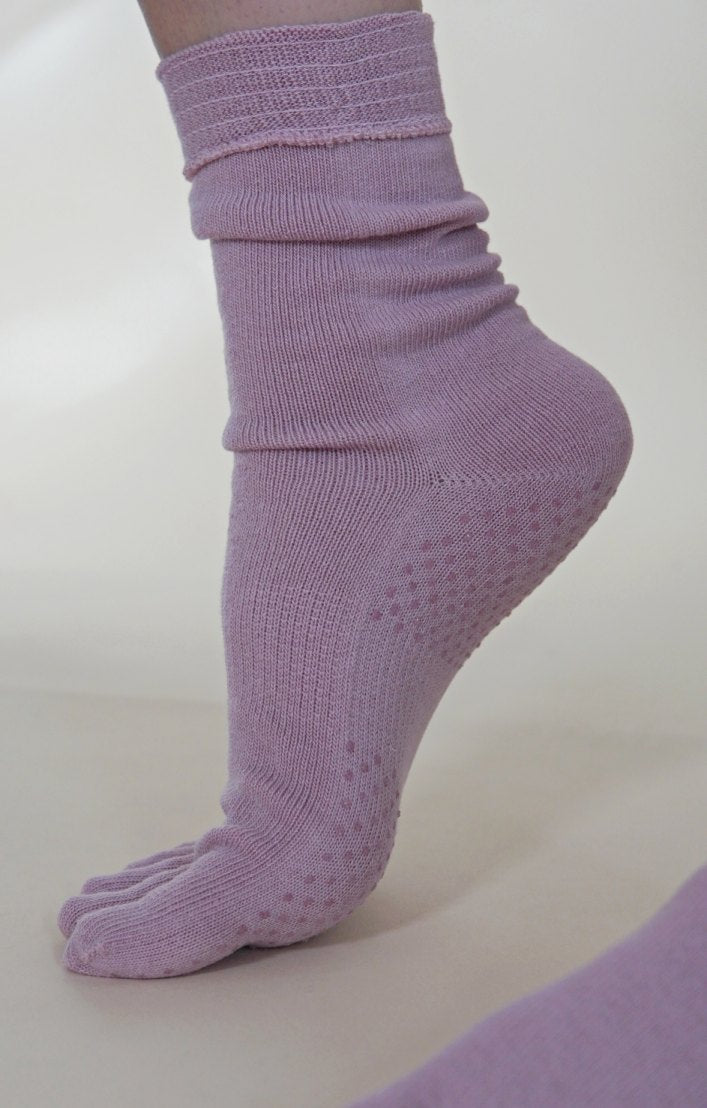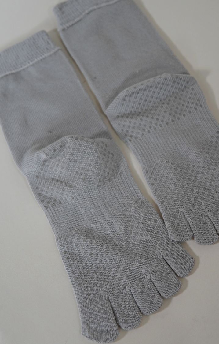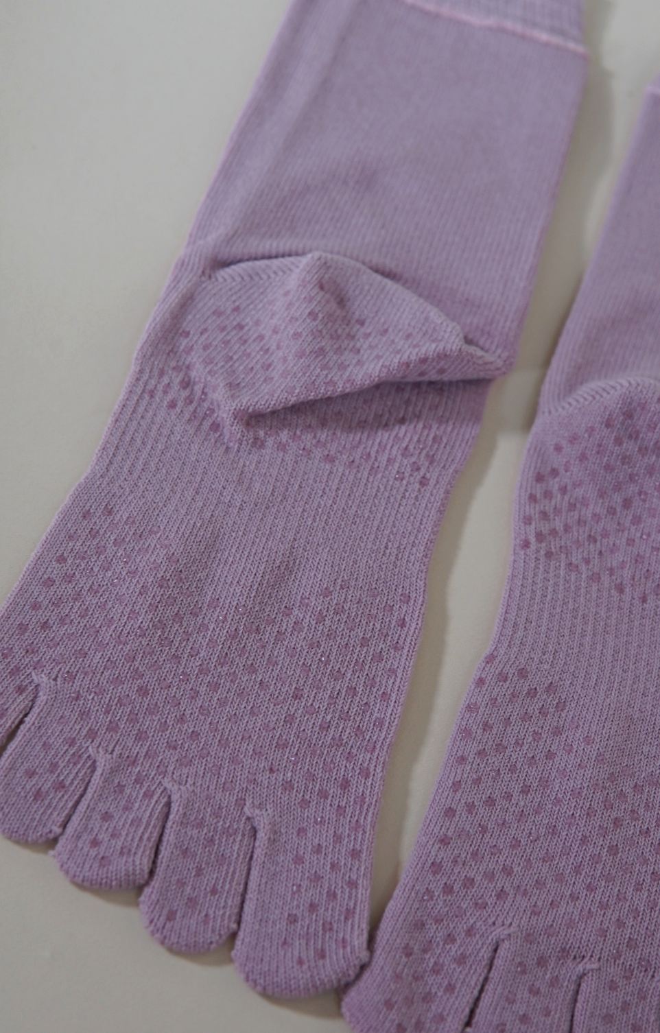 These five toe socks offer a relaxed, comfortable fit while keeping you steady on smooth surfaces with their non slip grip sole.